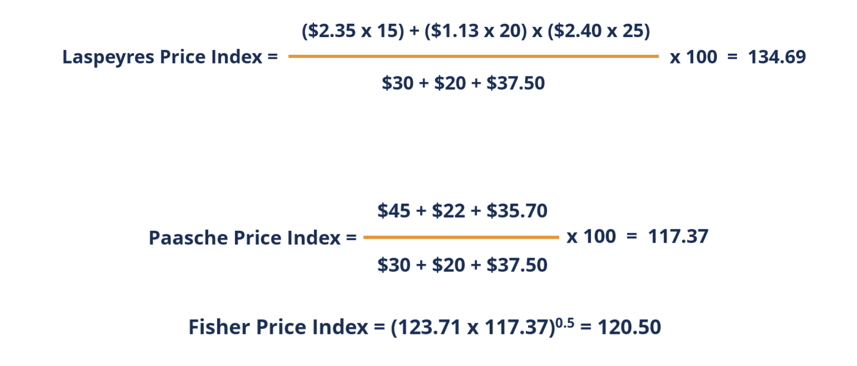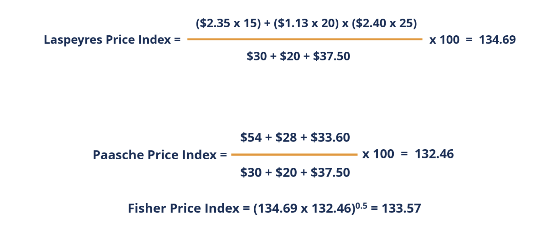- \(\sum P_{i0} Q_{i0} = (2 \times 10) + (5 \times 5) = 20 + 25 = 45\)