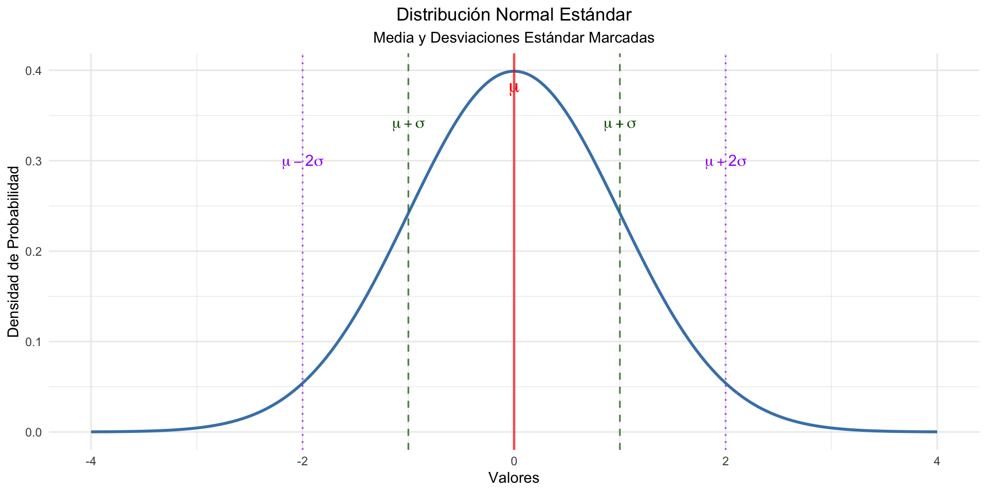 Desviación Estándar (σ): Mide la dispersión o la “anchura” de la campana. Una σ pequeña significa datos agrupados cerca de la media, mientras que una σ grande indica mayor dispersión.