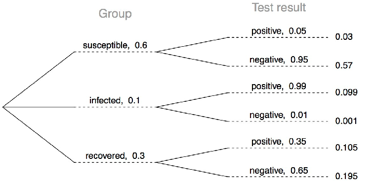Imagina una población en medio de una epidemia donde el 60% de la población se considera susceptible, el 10% está infectada y el 30% está recuperada. La única prueba para la enfermedad es precisa el 95% de las veces para individuos susceptibles, el 99% para individuos infectados, pero solo el 65% para individuos recuperados. (Nota: En este caso, “precisa” significa que devuelve un resultado negativo para individuos susceptibles y recuperados, y un resultado positivo para individuos infectados).